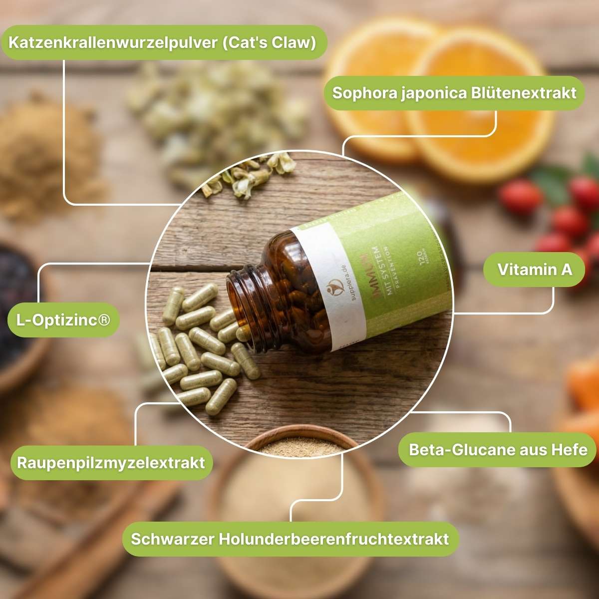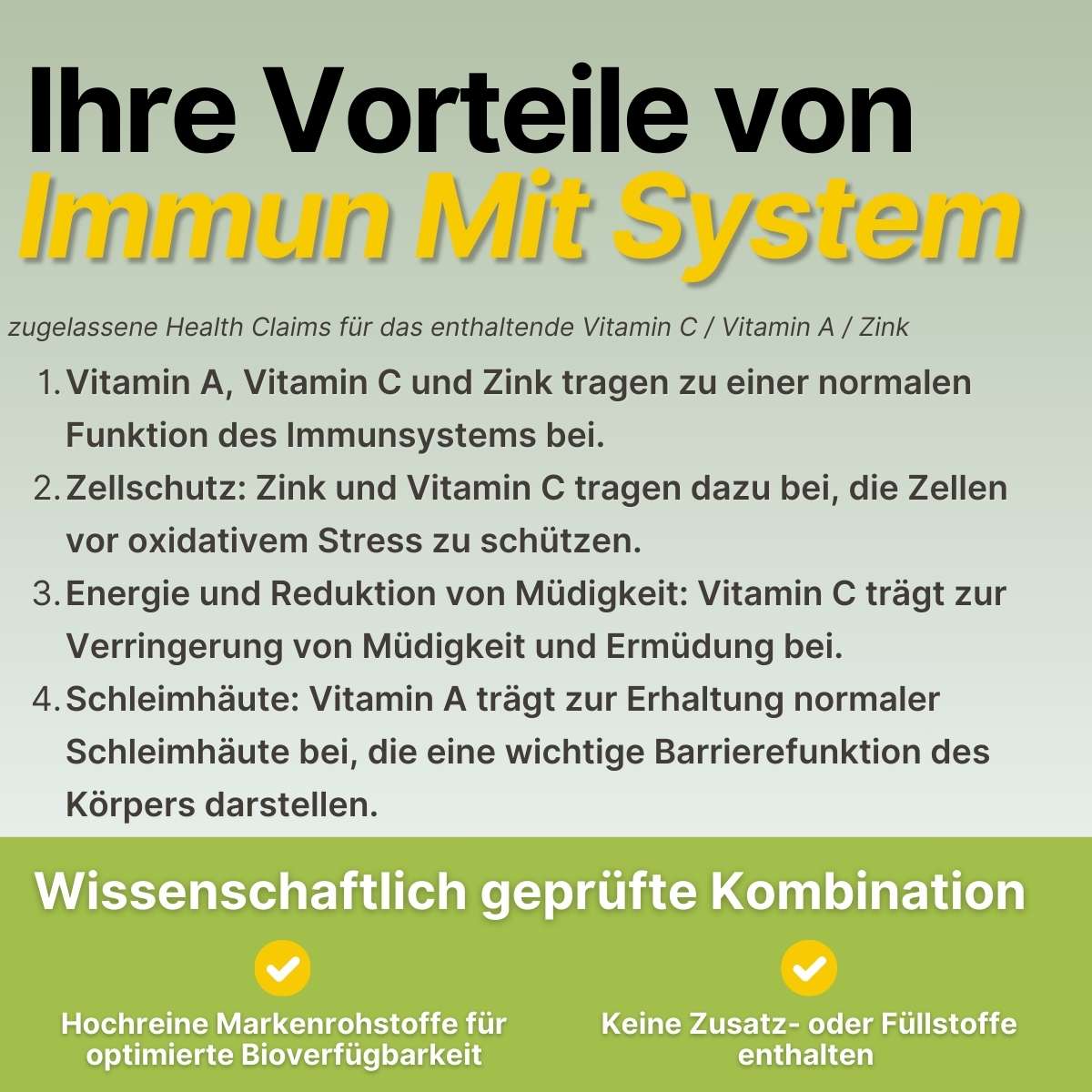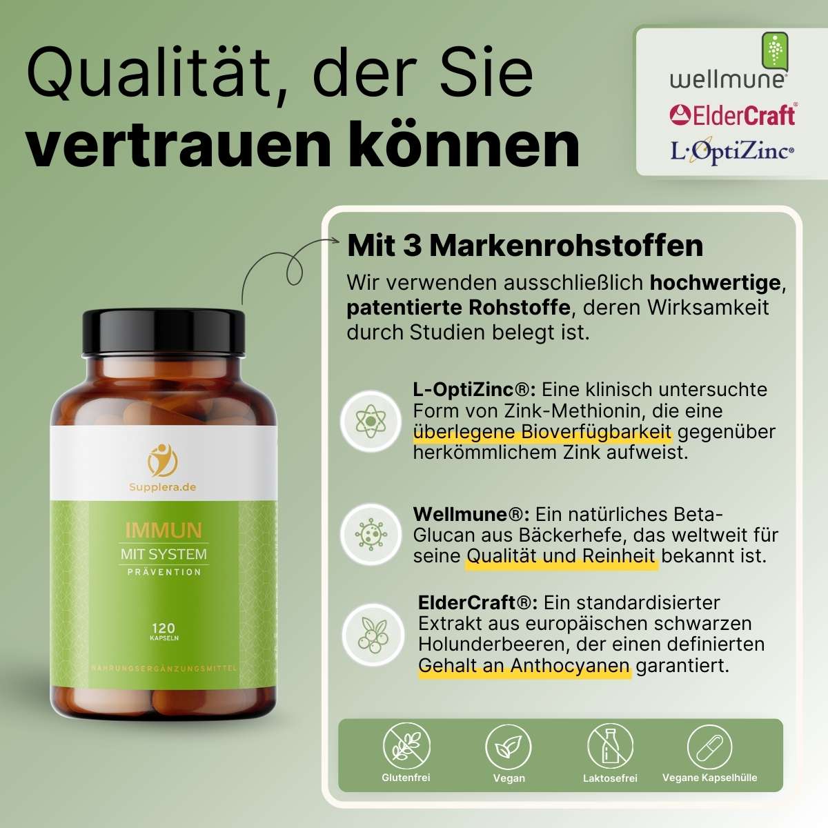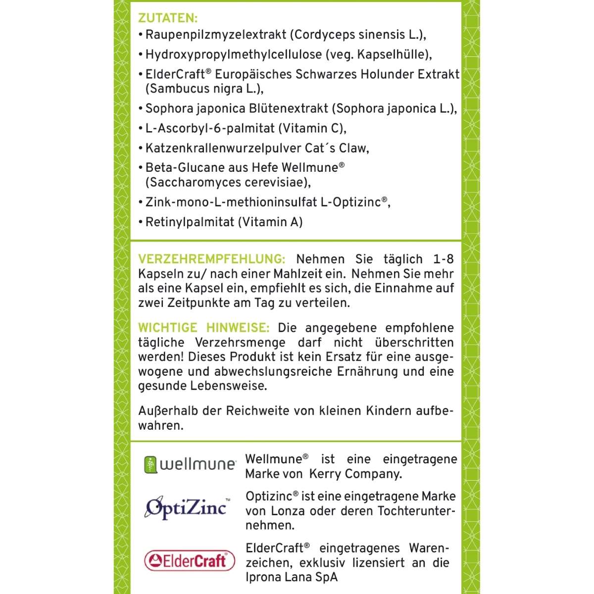 Markenrohstoffe: Wir verwenden patentierte, klinisch erforschte Rohstoffe wie L-OptiZinc®, Wellmune® und ElderCraft®, die deutlich teurer sind als generische Rohstoffe, aber eine garantierte Wirksamkeit und höhere Bioverfügbarkeit bieten.