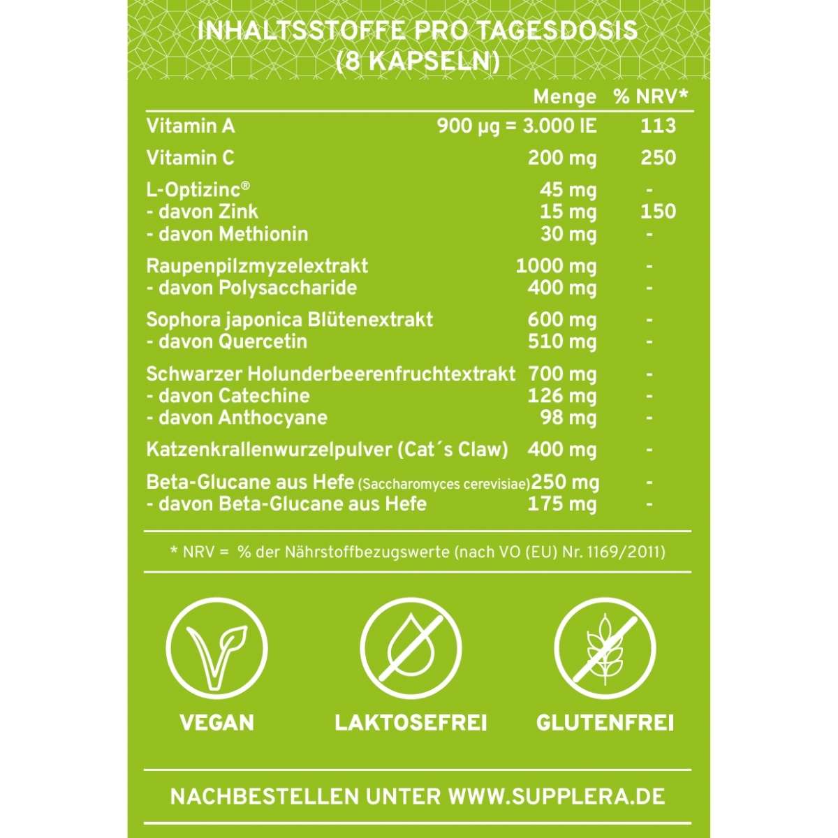 Grundsätzlich ja. Da das Produkt jedoch bereits Dosierungen von Vitamin A (113% NRV), Vitamin C (250% NRV) und Zink (150% NRV) liefert, sollten Sie darauf achten, diese Nährstoffe nicht über andere Präparate in übermäßigen Mengen zuzuführen. Insbesondere bei der Einnahme von Zink und Vitamin A sollten Sie die Gesamtzufuhr im Auge behalten. Im Zweifelsfall oder bei gleichzeitiger Einnahme von Medikamenten konsultieren Sie bitte vor der Anwendung einen Arzt oder Apotheker.