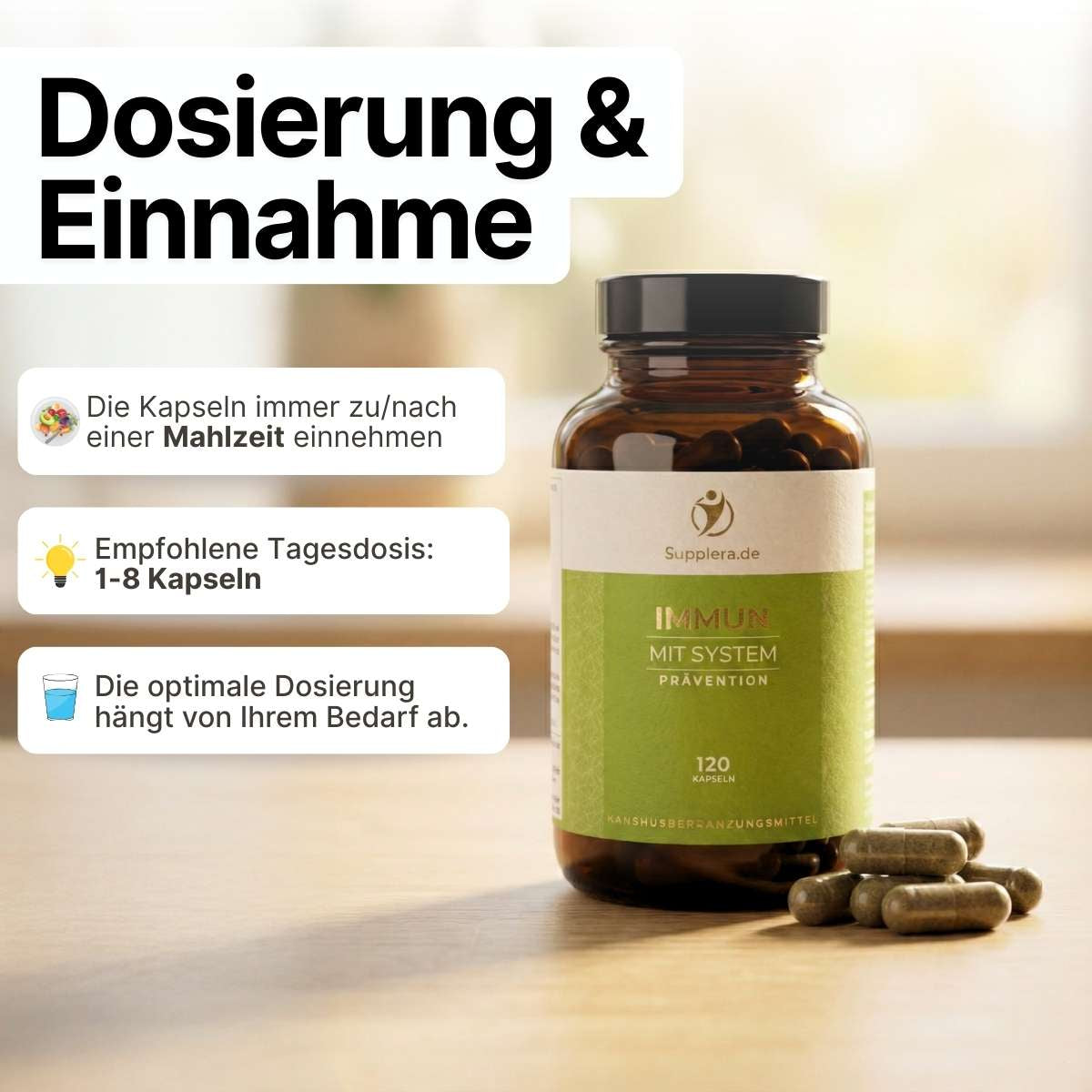 • Mittlere Dosierung (3-6 Kapseln): Geeignet in Phasen erhöhter Belastung oder wenn Sie das Gefühl haben, Ihr Immunsystem benötigt zusätzliche Unterstützung.