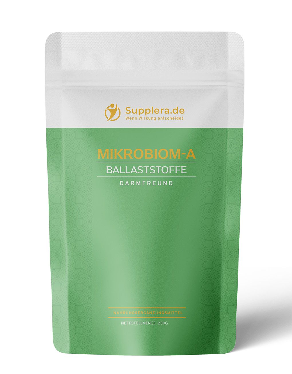 Ballaststoffe werden in einer vielfältigen Ernährung als Nahrung für unsere Darmbakterien angesehen. Die Ballaststoffe von Supplera Mikrobiom-A werden langsam in unserem Darmtrakt verarbeitet und haben keinen Geschmack, keine Farbe oder Geruch. Sie lösen sich zudem vollständig auf.